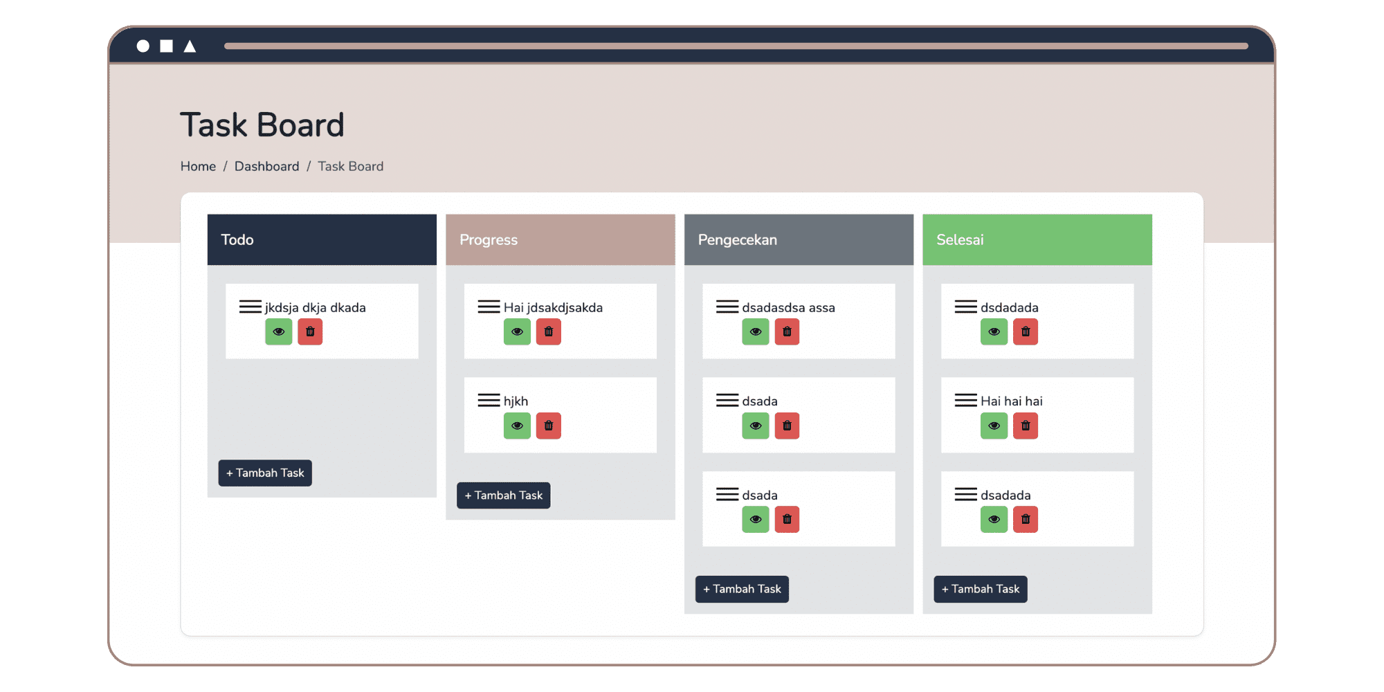 Manajemen bisnis dalam bentuk Kanban task board. Isi detail task dan drag-and-drop statusnya kapan saja dibutuhkan.