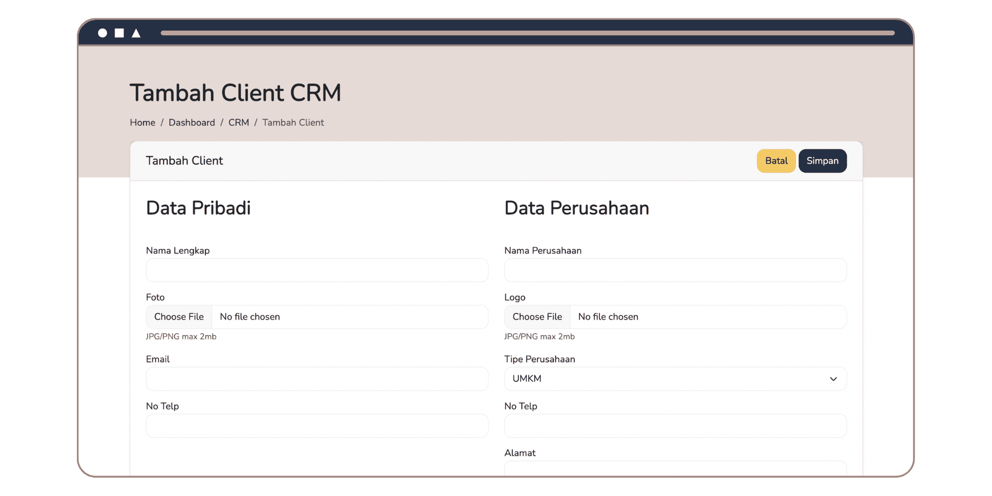 Tambah klien baru ke sistem CRM, apabila client memiliki akun Bizpro, kamu bisa menambahkannya sebagai akun Bizpro di halaman CRM.
